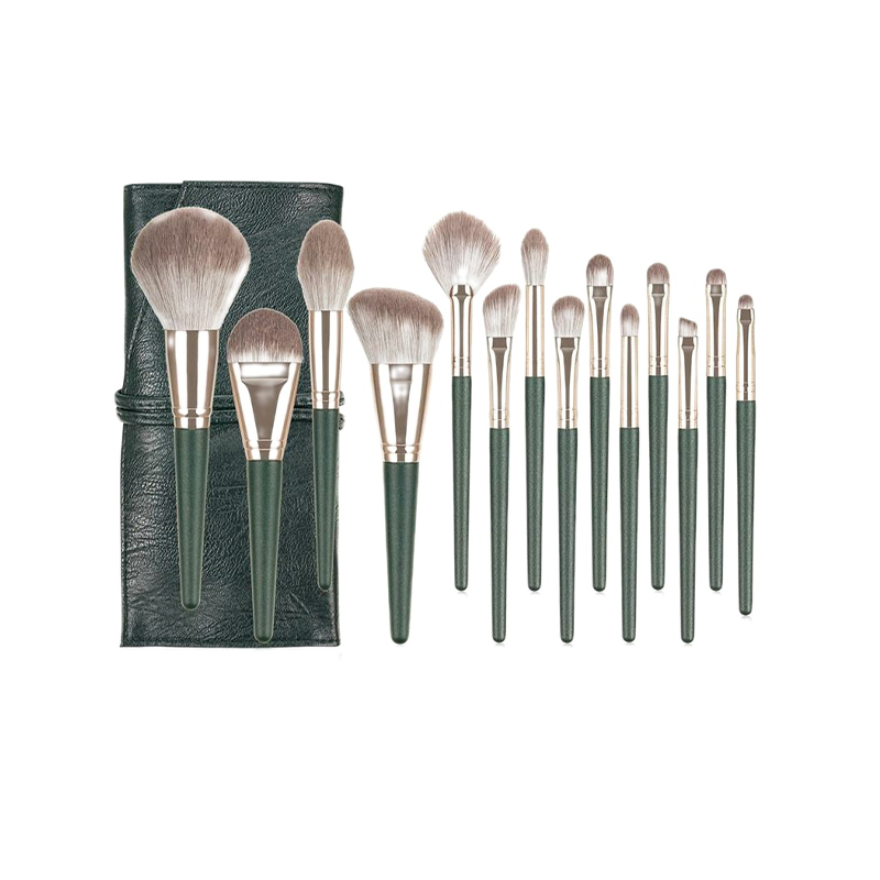 ست براش آرایشی مدل G1 رنگ سبز 14 عددی به همراه کیف چرمی