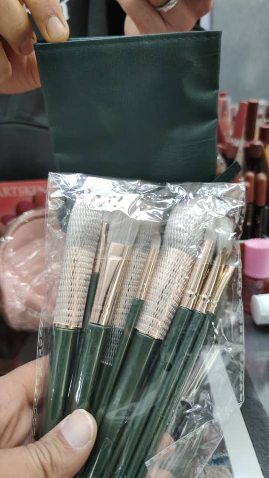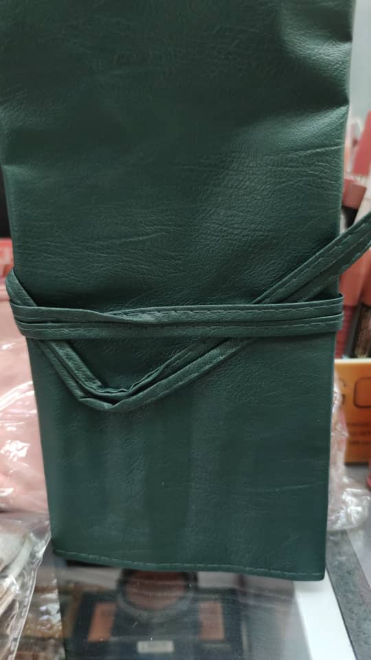 ست براش آرایشی مدل G1 رنگ سبز 14 عددی به همراه کیف چرمی