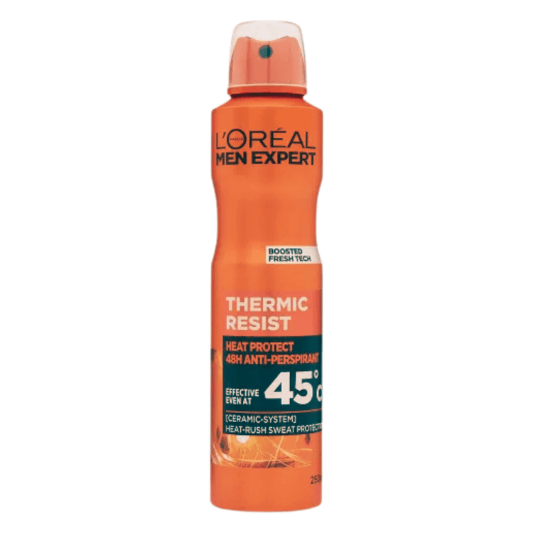 اسپری بدن مردانه لورآل مدل Thermic Resist ( سایز : 250ml ) ، ساخت فرانسه ، محصولی فوق العاده که از تکنولوژی {سیستم سرامیکی} بهره می برد ؛ این تکنولوژی باعث محافظت در برابر عرق ناشی از گرما می شود و در نتیجه برای هوای گرم و فعالیت های بدنی بالا انتخاب ایده آلی برای آقایان است . طبق گفته شرکت معتبر لورآل ، این اسپری حتی در دمای 45 درجه سانتی گراد اثربخشی دارد و می تواند در دمای بالا هم در برابر تعریق موثر باشد . از دیگر ویژگی های اسپری تِرمیک رسیست لورآل ، بدون الکل بودن آن است و در کنار ماندگاری بالایی که دارد از بوی بد جلوگیری و میزان تعریق را کنترل می کند . این اسپری را همین حالا از سایت فروشگاهی لوکس مَرد سفارش دهید و در طی کمتر از چند روز درب منزل تحویل بگیرید .